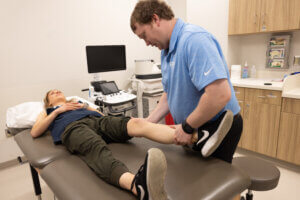 Man is getting a leg ultrasound at Forte Sports Medicine during shockwave therapy session